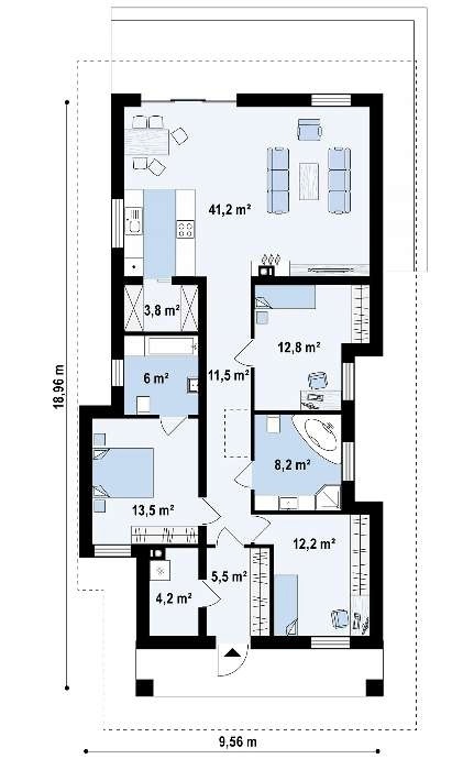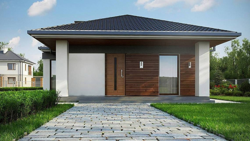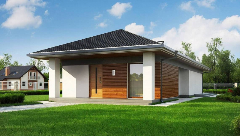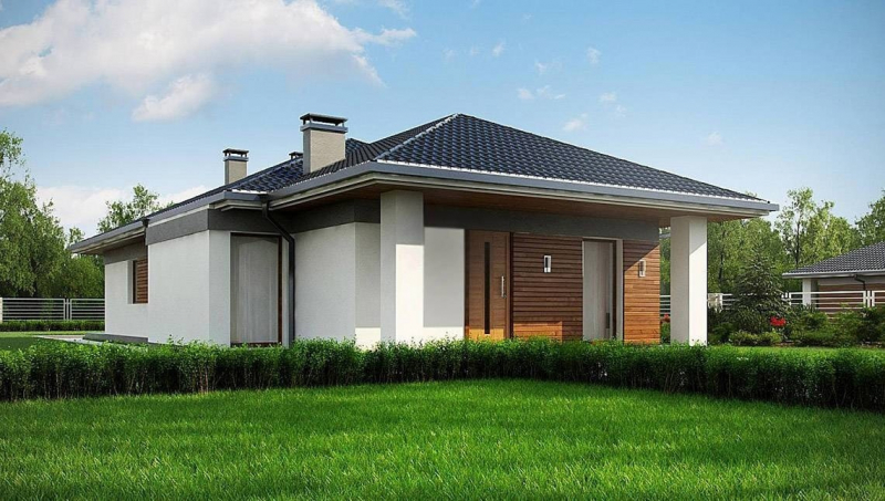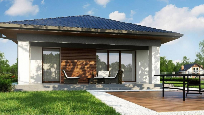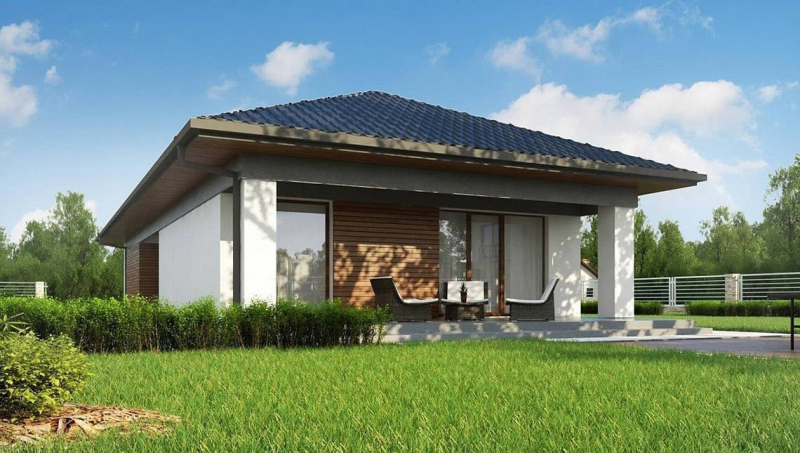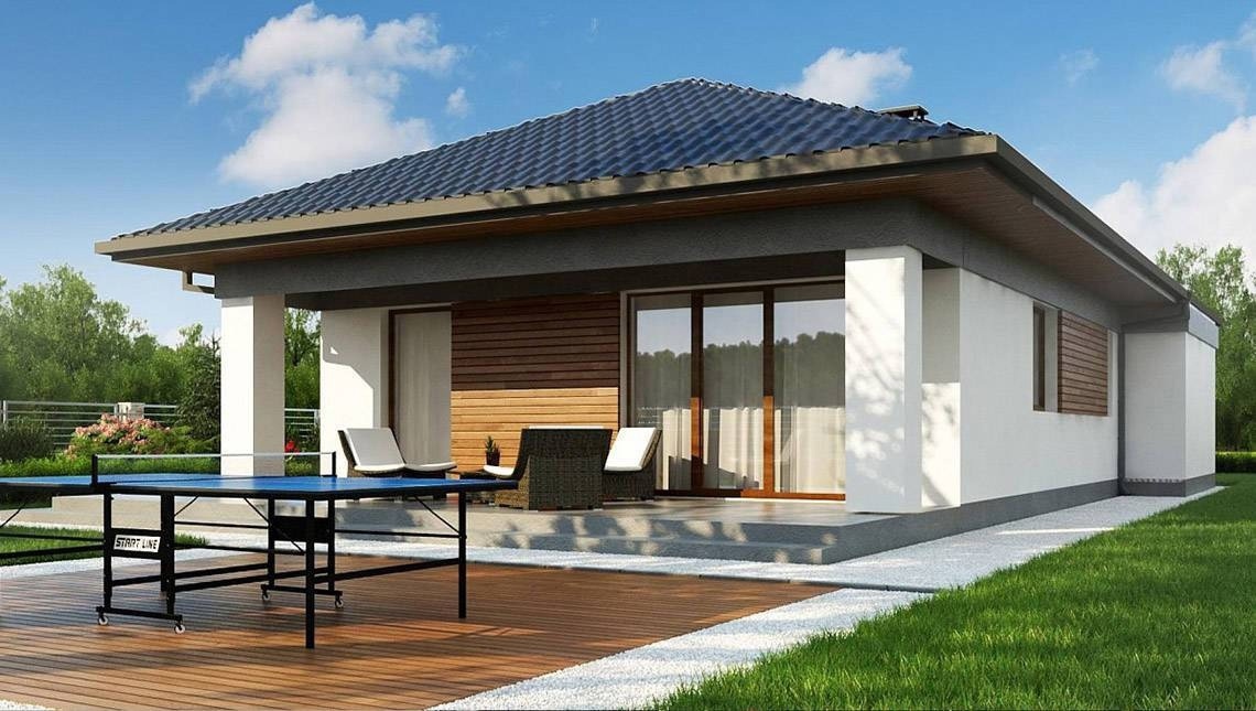 Проект коттеджа. Дом хоть и одноэтажный, а все же 3 спальни, 2 санузла и гостиная-столовая большая.